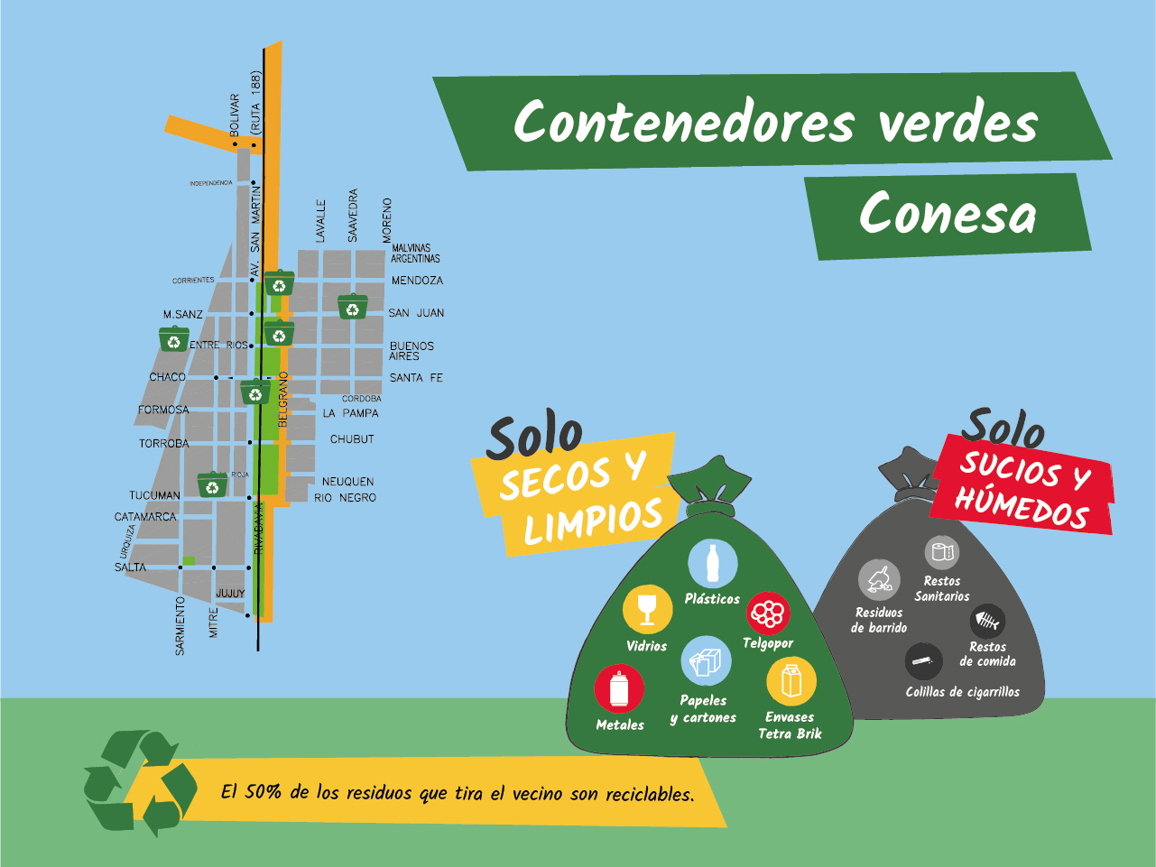 Son 6 los contenedores que se instalaron en la delegación y en ellos, sólo se pueden depositar residuos reciclables, limpios y secos, que serán retirados por la Cooperativa de recuperadores en cada uno de los puntos verdes.
